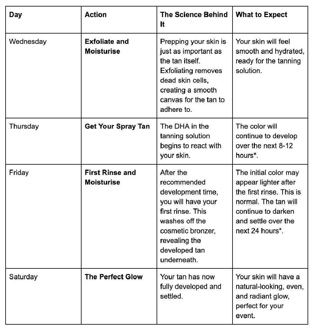 This chemical reaction doesn't happen instantaneously. While you will see an immediate bronzing effect from the cosmetic bronzer in the solution, the real color from the DHA develops over several hours. It can take up to 24 hours for the tan to fully develop, and another 24 hours for it to "settle" into the skin. This settling period is when the color evens out, and achieves its most natural and radiant appearance. By tanning on a Thursday for a Saturday event, you are giving your skin the right amount of time to go through the process, resulting in the perfect glow up.